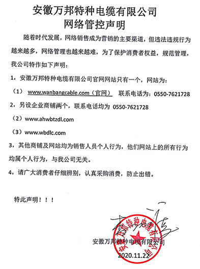 鄭重聲明:安徽萬邦特種電纜有限公司官方網站為:www_wanbangcable_com.idihxgg.cn,除此之外無任何子網站或合作網站,其余均為假冒偽劣。電話:0550-7621728 13485756353 地 址:安徽省天長市滁州高新技術產業開發區經四路29號